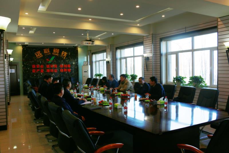 公司总经理佟国山、党委书记刘欣、常务副总经理李正宝及能源、环保、设备等相关技术部门负责人与廖世波总经理一行在公司二楼会议室进行座谈交流。双方就企业结构优化、绿色布局、产业链延伸等钢铁行业高质量发展热点开展深入的研讨与详细交流。